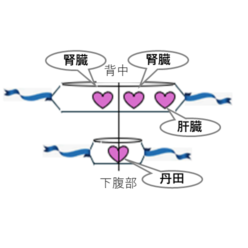 1個が電子レンジ600Wで50秒 - 温めたあずきのチカラをイラストを参考に帯に入れ、肝臓、腎臓、丹田の位置にあてて巻く。